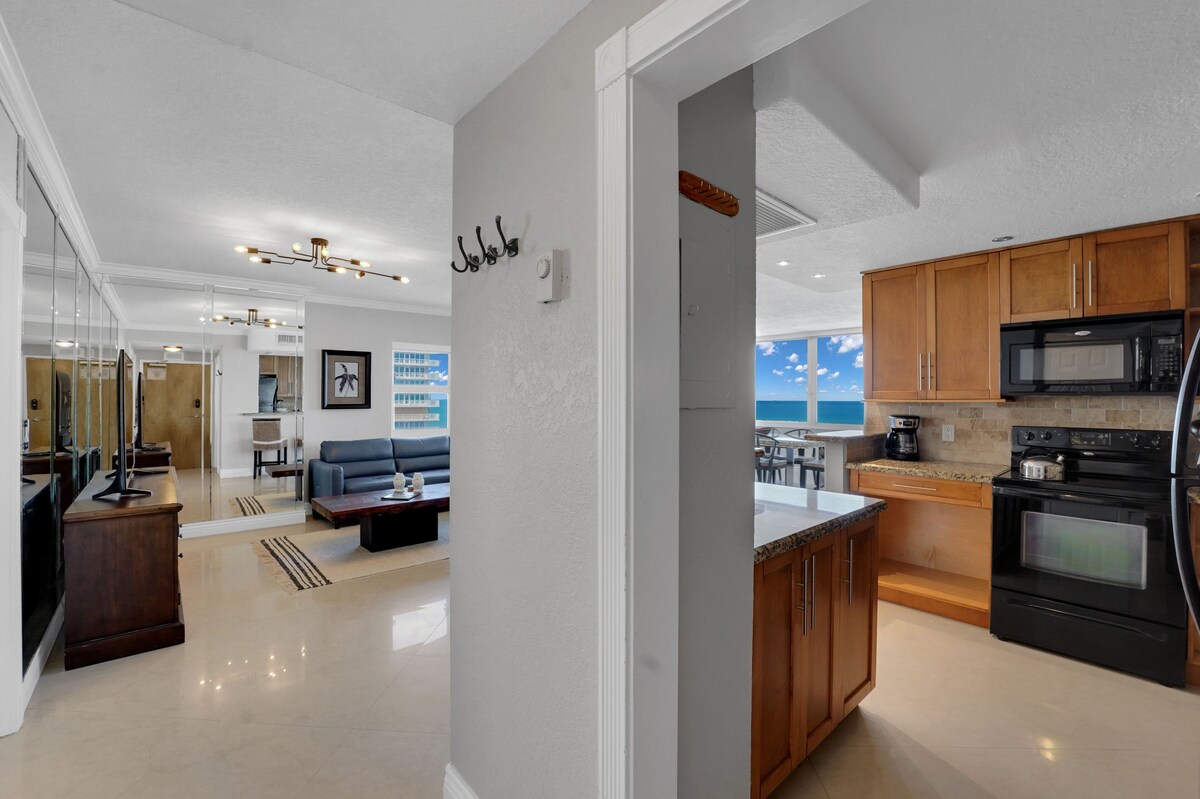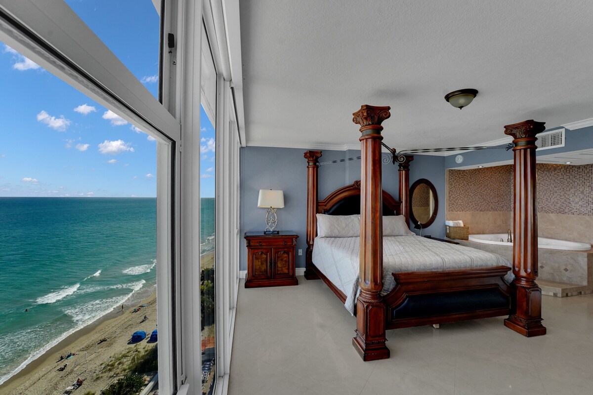 This 2BR/2BA has amazing views from the 10th floor. Just take the elevator down and walk out the back door and you are on the beautiful sand beach. On site amenities include heated beachfront pool, onsite beach bar, salon, spa and great restaurant. This condo is in the heart of the Galt ocean mile which is filled with plenty of restaurants and shops. Only a mile from Lauderdale by the sea and a short drive to Las Olas Boulevard. LIVING AREA Includes two comfy sofas and two recliners with large TV . A convenient desk area for checking your emails. And a relaxing high table for two to enjoy your morning coffee with great views of the ocean. KITCHEN & DINING Granite countertops and a well equipped kitchen. Kitchen island with two bar stools create a great breakfast bar or social bar for the evening. Round dinning table for four. BEDROOMS and BATHROOMS Condo includes two bedrooms that sleep six and two bathrooms. Floor to ceiling windows offer jaw dropping ocean views from the stately king size bed in the master suite. Bedroom also has a flatscreen TV and an in room oversized jacuzzi tub. En-suite master bathroom with walk in tile shower. Second bedroom features two double/ full beds, flat screen TV and en-suite bathroom with tile walk in shower. OUTDOOR AREAS Take a refreshing dip in the beachfront heated pool then sunbathe on loungers or a private poolside cabana overlooking the Atlantic. The pool deck is located just steps from the shoreline. Spend sunfilled days splashing in the surf enjoying water sports and relaxing on the 200’ private beach. Sip drinks during happy hour at the tiki bar or grab a treat from the coffee snack bar. Extra Amenities Valet parking is available for $15 per day. Complimentary Wifi included, a coin operated laundry room in the basement of the building. The Bamboo Beach Tiki bar and Cafe, the casa calabria and the Omn Salon and Spa are located on-site Our prices include all fees. No hidden fees.