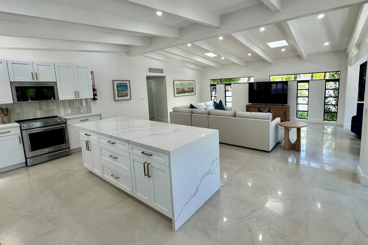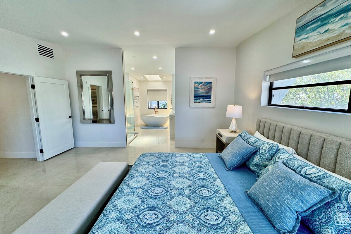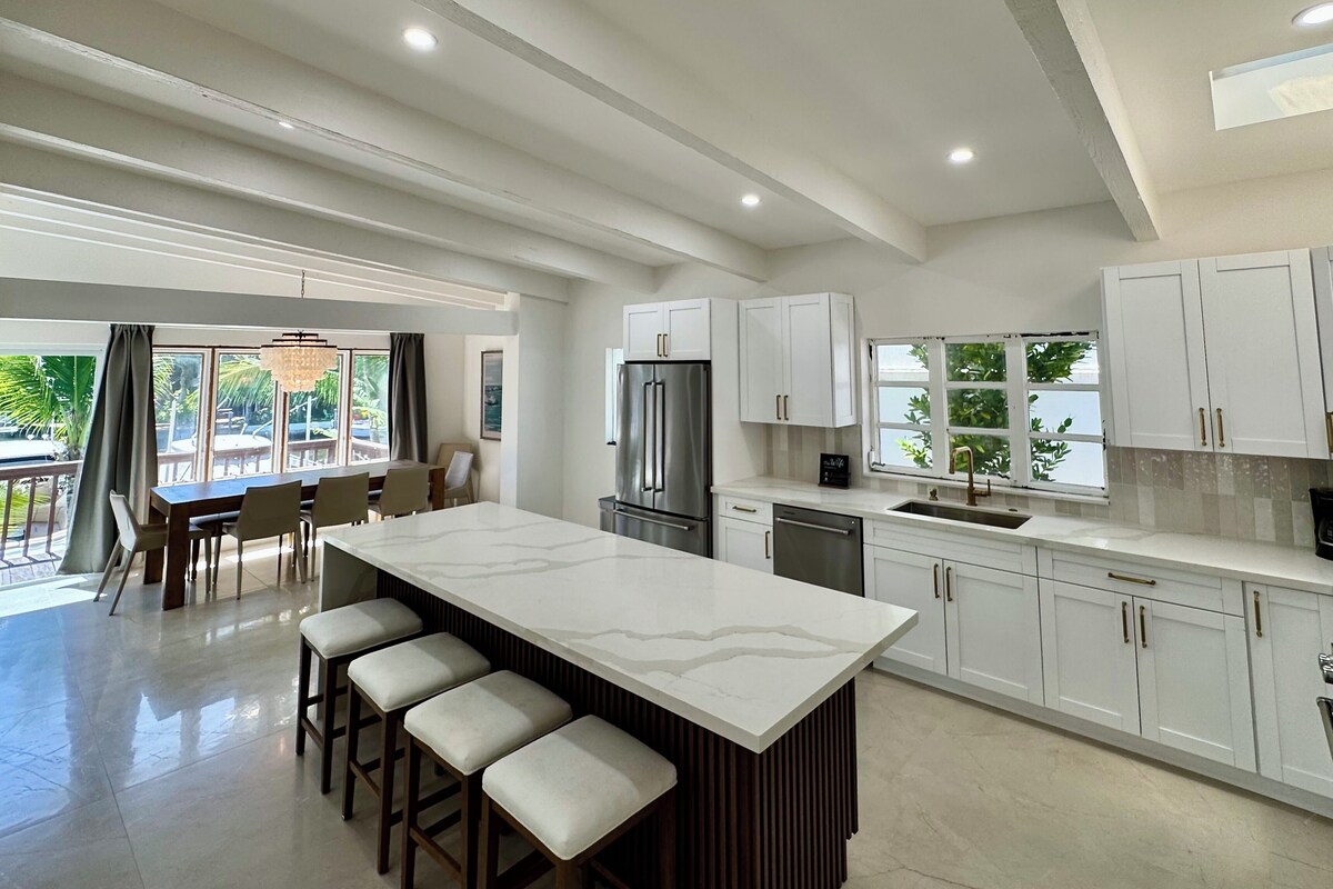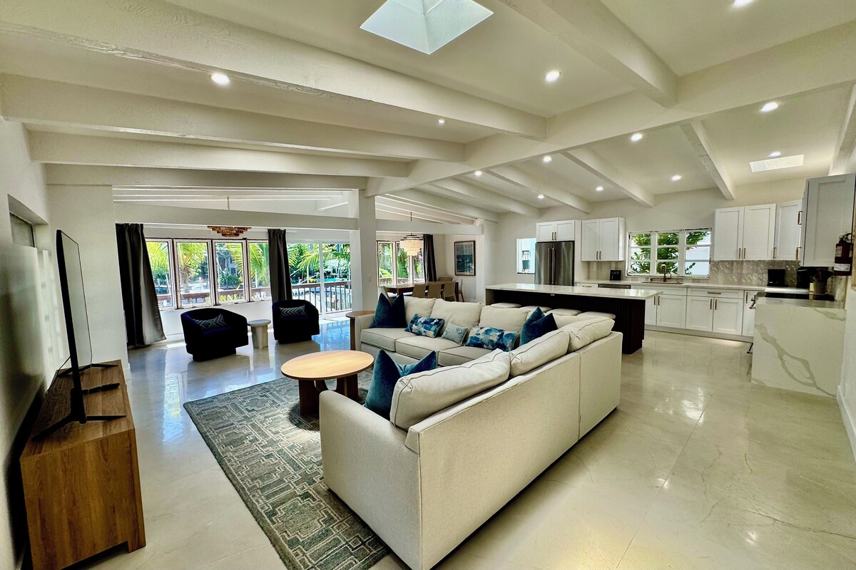 OUTDOOR SPACE: SHARED WITH THE DOWNSTAIRS UNIT - Large, shared swimming pool and outdoor patio with loungers. -The patio has a stainless steel BBQ grill that uses propane and an outdoor dining area (Propane tanks are available upon request for a $40 charge) LIVING AREA: - New furniture, kitchen and bathrooms - Dining room seats 8 - Large plush sofa - Streaming TV - Bar - Breakfast Bar - Private Sauna KITCHEN: Full kitchen is equipped with coffee machine, tea kettle, toaster, blender, cookware, glassware, dishwasher, refrigerator, ice maker, freezer, and microwave. All new Appliances BEDROOMS: (4) - Las Olas Escape sleeps 8 guests in comfortable beds. - Pac and Play and high chair on site - Sofa bed - Premium Air mattress available for a $25 delivery fee. BATHROOMS: (3) All bathrooms are provided with a starter set of toiletries (TP, soap) and plush towels. A hairdryer is also available. SHARED SEPARATE GAME ROOM: - Full size pool table - Large TV - Video Game controls - Mini basketball hoop with balls - Darts - And more INTERNET: - High speed and wireless throughout. GUEST ACCESS: - The personalized self check-in instructions will be sent prior to arrival. CLEANING: - All of our properties are professionally cleaned and sanitized up to CDC guidelines and inspected before each stay to ensure your safety. - Starter dishwasher pods are provided - Washer and dryer with a starter set of laundry pods provided. LOGISTICS: - Check-in: 4:00 PM. - Check-out: 11:00 AM. - An early check-in or late check-out time may be available, please inquire about availability and pricing. TV's: All of our TV's are Smart with access to log into your favorite streaming channels. MAINTENANCE SCHEDULE: - Weekly Landscaping service usually on Wednesdays or Thursdays in the morning. - Weekly Pool cleaning service usually on Thursdays in the morning. POOL: Pool is heated for a $15 per day service fee from November through April. Please note there is no lifeguard on duty and we ask that all guests enjoy the pool responsibly. The property owner is not liable for any pool-related accidents, drowning, or bodily harm/personal injuries. No diving is permitted. No glass is permitted in or near the pool, the kitchen is supplied with plastic cups. GARBAGE: The city of Fort Lauderdale removes garbage every Wednesday and Saturday morning. We provide three garbage bins on the side of the house. We ask that you please put out any used garbage bins in the front of the driveway Tuesday night and Friday night prior to collection. If you could please bring the bins back by the side of the house we would appreciate it. PARTIES & EVENTS: We do not allow parties, receptions or events. The home is located in a residential neighborhood and local ordinances dictate no excessively loud music or noise after 10PM. This is our most important rule that can result in the termination of your reservation along with additional fees. If you have any questions regarding entertaining on the property please contact us. PARKING: The driveway is located in front of the property and accommodates two (2) cars. Please refrain from parking on the street. PETS: Small pets are permitted upon request, please note, there is a $120 pet sanitation fee per pet for the duration of your stay. CAMERAS: These are placed outdoors only, outsourced to an external professional surveillance company solely to be used for security purposes and to ensure the safety of the property and travelers. PERSONAL BELONGINGS: ValGal isn’t responsible for any package delivery or personal belongings left at the property after check out. Please inquire directly for discounts on long term stays. We are looking forward to hosting your unforgettable stay! Our prices include all fees. No hidden fees.