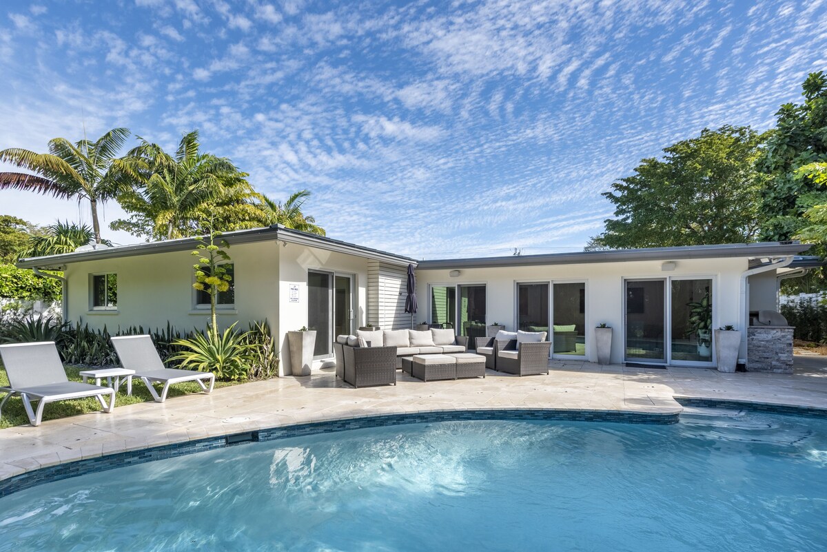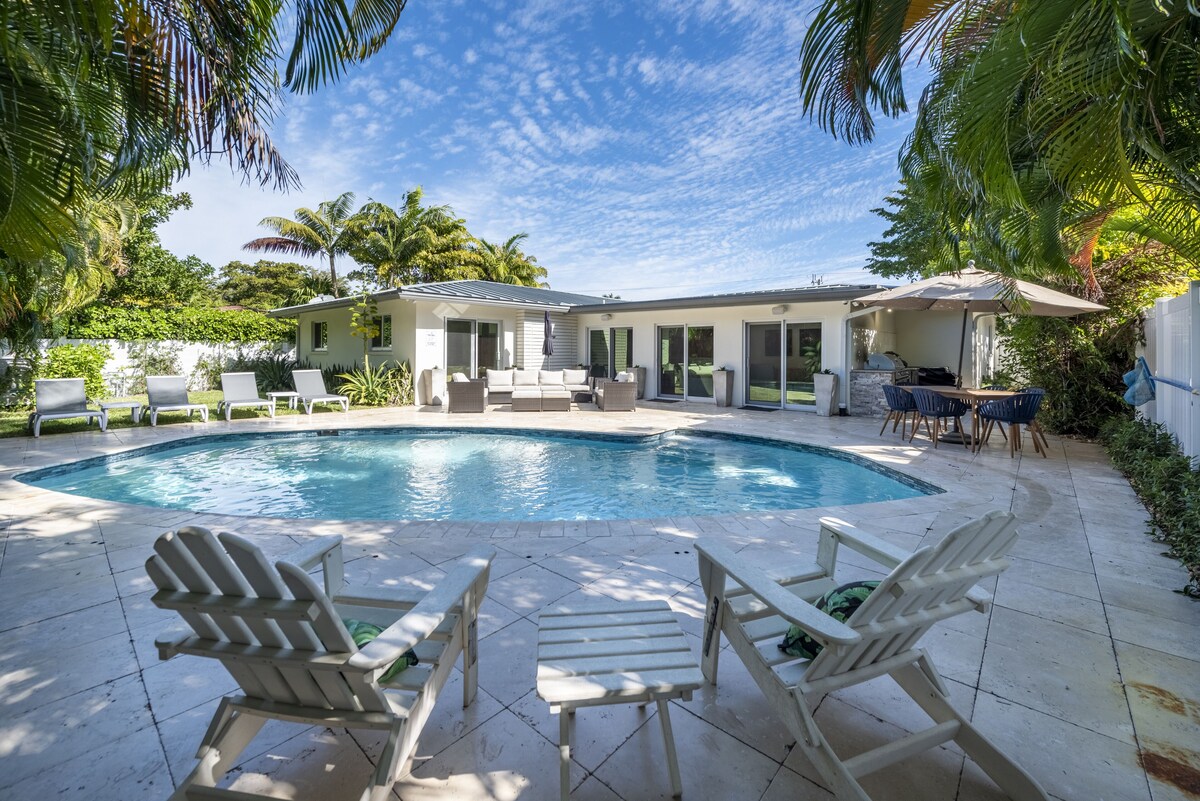 This beautiful home is in one of Ft. Lauderdale’s most sought-after neighborhoods. Location. Location. Location! It is a short walk from the house (less than 5 blocks) until your toes hit the sandy beach. The beach by the house gives you the most spectacular view of the widest beach of all of Ft. Lauderdale beaches. Bring your cooler and beach chairs to this quiet beach area, and enjoy a fun and relaxing day in the sun. This private residential neighborhood, called Harbour Inlet, is located less than one mile from Pier 66, the Fort Lauderdale Convention Center, and about 2 miles from Ft. Lauderdale Port, and the most iconic street in Ft. Lauderdale, Las Olas Blvd. It is only 12 minutes to the Ft. Lauderdale airport and a short Uber ride to many delicious restaurants, activities, parks, and nightlife. The house has recently been updated. It has fabulous state-of-the-art technology throughout, and the wifi is extremely fast. The open kitchen has high end Jenn Air appliances, a locking wine fridge, four barstools on one side of the island and five on the other side of the counter, with lots of space for any chef to create delicious meals. The dining room is very spacious with lots of seating, and a walk-up bar to enjoy your favorite cocktail. It also has a huge pantry for storing all types of food and a large capacity LG washing machine and dryer. There are two beautiful living rooms, both with their own 65” TVs and Sonos sound bars, and one with a spectacular view of the backyard pool and patio. This luxury home consists of four bedrooms, each with their own tv, and three bathrooms. The primary bedroom has a king bed, an en-suite bathroom, and a walk-in closet. This spacious bathroom is so relaxing. It has a shower that is digital and can be adjusted up to 106 degrees if desired, along with a double vanity sink, and a free-standing luxury tub. The second bedroom has a queen Posturepedic bed and a set of twin Posturepedic bunk beds. This bedroom shares a jack and jill bathroom with the third bedroom, and has a double vanity sink with a shower and tub. The third bedroom has a double bed as well as a trundle. The fourth bedroom, also with a Posturepedic queen mattress, has a beautiful view of the pool and lovely patio, and a desk for those that need to put in a few hours of work. This home sleeps 8 adults and 4 children. The gorgeous backyard is so relaxing you won’t want to leave. The large, heated saltwater pool is refreshing and inviting. It’s extremely private, with a very comfortable sitting area with two umbrellas, and a large dining table for your al-fresco meals. The wonderful patio also has a large gas grill, a fridge to keep your drinks cold, a pizza oven, and a large hibachi style grill. This summer kitchen has everything you’d want to enjoy your Ft. Lauderdale dining experience. There is plenty of space for driveway parking that accommodates 6 cars. This is a beautiful and safe walking neighborhood lined with mulit-million dollar homes. We have bikes, a beach buggy, chairs, beach and pool towels and water toys for you to use during your stay. We look forward to hosting you at the Incredible Inlet Harbour home! Our prices include all fees. No hidden fees.