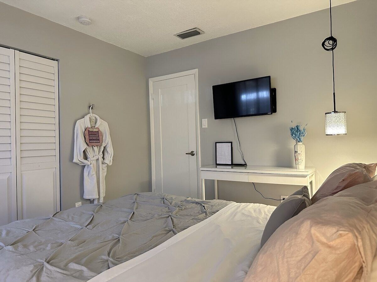 Summary: Beautifully remodeled 2- bedroom villa includes open kitchen, new appliances, spacious living and dining rooms, power reclining sofa, wifi and TV's in each room. Spacious master California King bedroom has private bath and direct exit to the jacuzzi in the private backyard. Second bedroom overlooks patio area with adjacent full bath. Third sleeping area has futon. Two private outdoor living areas have seating and large table for dining. Free parking right in front. Great Fort Lauderdale location. The Space: This is a beautifully remodeled, designer villa, completely renewed with plenty of room for relaxing both inside and out. It includes a large open kitchen complete with new appliances and everything you need to make your own meals. The dining and living room areas are also open and spacious as well with a power reclining sectional sofa, large tv and plenty of room for relaxing and family fun. Each room has its own tv, and all are Netflix ready. The spacious master bedroom with California King bed includes a luxurious private bath and walk-in closet and a direct exit to the hot tub. A second bedroom overlooks the front patio area, and has an adjacent luxurious bathroom with step-in shower. There is a third sleeping area with futon overlooking the back yard/garden area. There are two private outdoor living areas with plenty of seating and a generously sized table for sharing outdoor meals. The fenced-in back yard area features a lovely water garden view, a covered patio with hot tub and plenty of comfortable seating and tables for friends and family to enjoy. Guest Access: Guests will have access to the entire home with 2 bedrooms, 2 full baths, additional sleeping area, full kitchen, spacious dining room and living room area and private front and back patios. The Neighborhood: This newly remodeled gem is located in a nice, quiet residential neighborhood close enough to all the fun Fort Lauderdale has to offer including concerts, events and festivals year-round. It is just 15 minutes from the beach and Pompano Pier, 20 minutes from Fort Lauderdale Beach, 30 minutes from the Sawgrass Outlet Mall, and 10 minutes from Butterfly World. Fort Lauderdale Executive airport is just 10 minutes away and Fort Lauderdale International Airport is only 25 minutes away. The Famous Hard Rock Guitar Hotel is 30 minutes away, and Casino Harrahs is only 10 minutes away. The Hard Rock Stadium is less than an hour away. For soccer fans, DRV PNK Stadium is only 9 minutes away. Everglades Airboat rides are 40 minutes away. There are also many other local attractions including the Museum of Discovery and Science, the Bellagio Gallery, the Coral Springs Museum of Art, and the Ah-Tah-Thi-Ki Museum, classic car museums and so much more, and there are fun activities including charter boat fishing, luxury yacht rentals, parasailing, and scuba diving. Fort Lauderdale is also home to some of the best golf courses in south Florida. Our prices include all fees. No hidden fees.