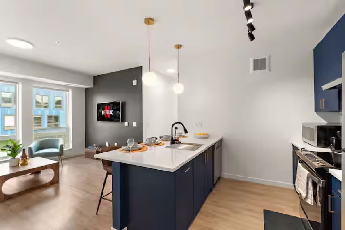 Welcome to your upscale 2-bedroom, 2-bathroom hideaway in the heart of downtown Minneapolis. This brand-new luxury condo combines urban elegance with next-level comfort, perfect for a stylish city escape or a work-play retreat. Soaring ceilings, designer touches, and warm natural light create a space that feels indulgent, yet inviting. 3 Total Beds (2 Queens + Pullout Couch) | Sleeps 6 Comfortably ⸻ ★ BEDROOM & LIVING AREA ★ Designed for effortless flow and modern vibes, this 2-bedroom sanctuary is thoughtfully styled with sophisticated decor and elevated finishes. Whether you’re starting your day or winding down, every corner invites you to relax in luxury. ★ Bedroom 1 ★ ✔ Plush Queen Bed with Luxe Bedding ★ Bedroom 2 ★ ✔ Plush Queen Bed with Luxe Bedding ★ Living Room ★ ✔ Sleek Pullout Sofa for Lounging or Extra Sleeping ✔ Chic Coffee Table ✔ 55” 4K HDR Smart TV — Stream, Chill, Repeat ⸻ ★ KITCHEN & DINING ★ Cook up a gourmet meal or keep it casual—your modern kitchen has everything you need to make it memorable. The open layout, soaring 12ft ceilings, and premium appliances elevate every moment. ✔ Stainless Steel Appliances (Microwave, Oven, Stove, Refrigerator) ✔ Dishwasher for easy cleanup ✔ Coffee Maker + Essentials ✔ Air Fryer ✔ Kettle, Cookware, Glassware & Silverware ✔ Ample Counter Space for Dining or Entertaining ⸻ ★ BATHROOM 1 ★ Your private spa-like bathroom is stocked and ready—just bring yourself. Clean lines, premium toiletries, and fluffy towels make every routine feel indulgent. ✔ Sparkling Clean Bath & Shower Combo ✔ Modern Vanity & Well-Lit Mirror ✔ Fresh Towels & Toiletries Provided ★ BATHROOM 2 ★ Your private spa-like bathroom is stocked and ready—just bring yourself. Clean lines, premium toiletries, and fluffy towels make every routine feel indulgent. ✔ Sparkling Clean Bath & Shower Combo ✔ Modern Vanity & Well-Lit Mirror ✔ Fresh Towels & Toiletries Provided ⸻ ★ EXTRAS ★ ✔ Fast Wi-Fi ✔ In-Unit Washer/Dryer ✔ Central Heating & Cooling ✔ Professionally Cleaned After Every Stay ⸻ Step outside and you’re minutes from iconic Minneapolis gems—U.S. Bank Stadium, the Convention Center, and the city’s top restaurants, bars, and shops. Whether you’re here for business, pleasure, or both, this luxurious space gives you the best of both worlds. Check our profile for more stays across the city if your dates are taken. We’ve got you covered. We can’t wait to host your Minneapolis moment. Our prices include all fees. No hidden fees.