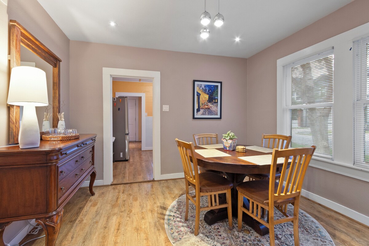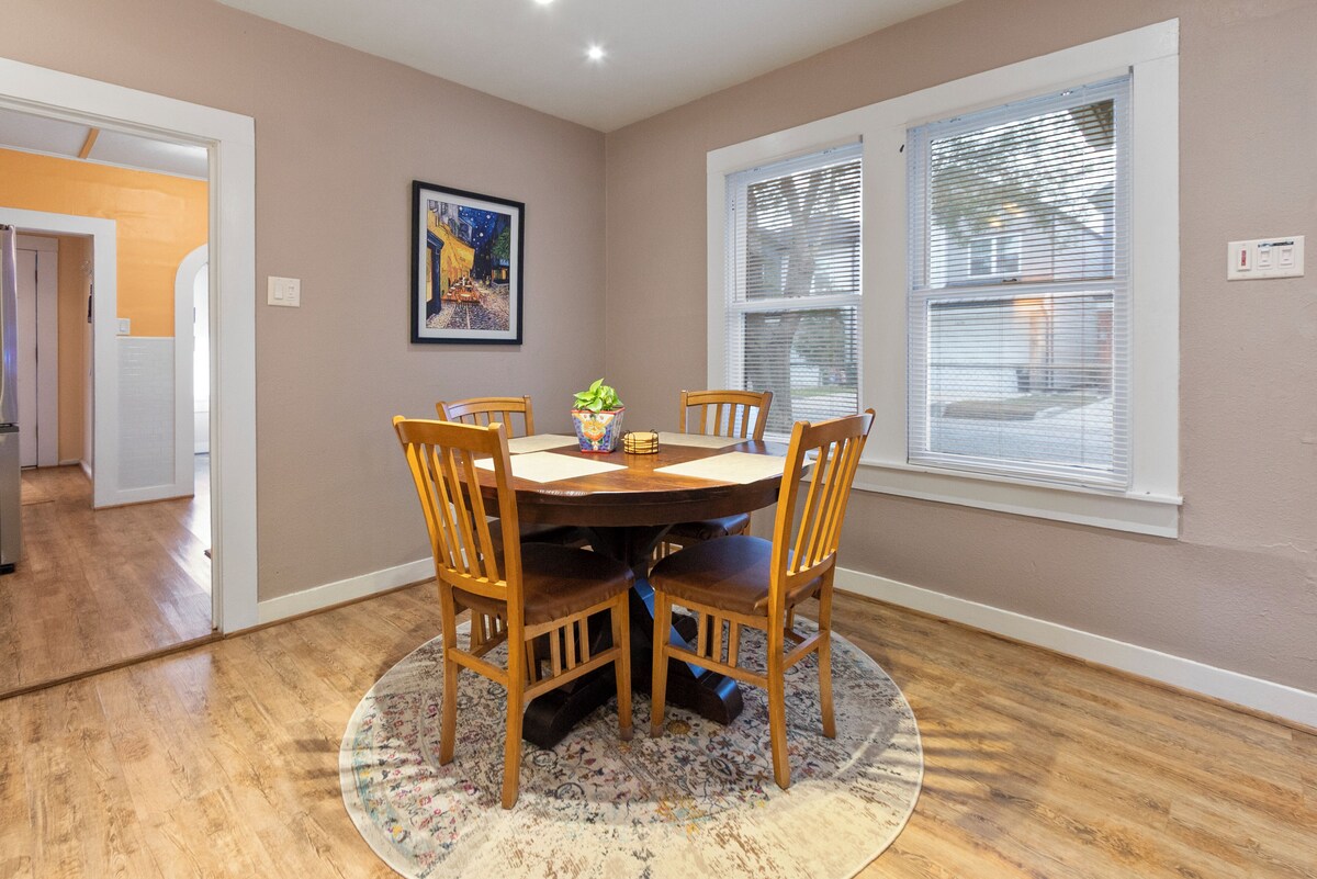 Welcome to this charming house with 3 bedrooms, 2 queen beds, a dedicated office and private yard. The house was built in 1930 and sports an industrial flair. This is a terrific spot for longer stays, whether you will be traveling for business, working from home, waiting on a home to be built, or longer leisure travel. A standby generator will help you get through those power outages. It runs a weekly test and automatically kicks in when electricity goes out. The house is fully-equipped so you can enjoy your home away from home experience. We have mini blinds and blackout curtains, LED vanity mirrors, bedside reading lamps and nightstands in both bedrooms. 1 bedroom has a 43” TV. The office area has an adjustable desk. The bathroom is outfitted with a shower and we provide a hair dryer, towels and starter bath products. Watch your favorite flix on the OLED TV in the living room, relax on the swivel chairs or take snooze on the couch. The kitchen comes with a reverse osmosis water filter, lots of cooking utensils, pots & pans, bakeware, a gas stove and dishwasher. If you don’t want to cook, no problem, you will be appx 5 minutes away from eateries and breweries on 34th St or Alba/Wakefield, or try Hughies Tavern & Grill offering Vietnamese dishes a couple of blocks West. Bring home your leftovers cause you'll have a full-size fridge to keep food fresh and a microwave to warm it up later. The laundry room has a washer and dryer with starter laundry products. Outdoor amenities include a seating area on the covered deck and a BBQ pit. B&W Meat Market is a short walk away for fresh grillin’ proteins. Aldi, Whole Foods, Kroger and HEB are nearby if you prefer. Shepherd Park is one block away if you want to enjoy a walk with your fur baby. Fully fenced property with spacious parking area is well-lit at night and requires coded gate entry for parking up to 3 cars. Services: We provide Light cleaning bi-weekly. Light cleaning consists of dusting and wiping surfaces, sweeping/vacuuming, bathroom cleaning. Light cleaning also includes weekly linen exchange of one-for-one towels and bedsheets. Linen sets will be removed and replaced on beds. Deeper cleaning and other laundry services will be at additional cost to the guest. Property maintenance includes bi-weekly lawn service and quarterly pest control. Conveniently located 2 miles north of 610N Loop which gets you to the Medical Center, Galleria, or I-10E to LBJ Hospital, I-10W to Energy Corridor, and easy access to I-45N to/from IAH airport. Head I-45S and be downtown in 20 minutes for the theatre district, major sports events, downtown festivals or Discovery Green. Keep driving South to Hobby airport about 30 minutes or be in Galveston in about an hour. Our prices include all fees. No hidden fees.