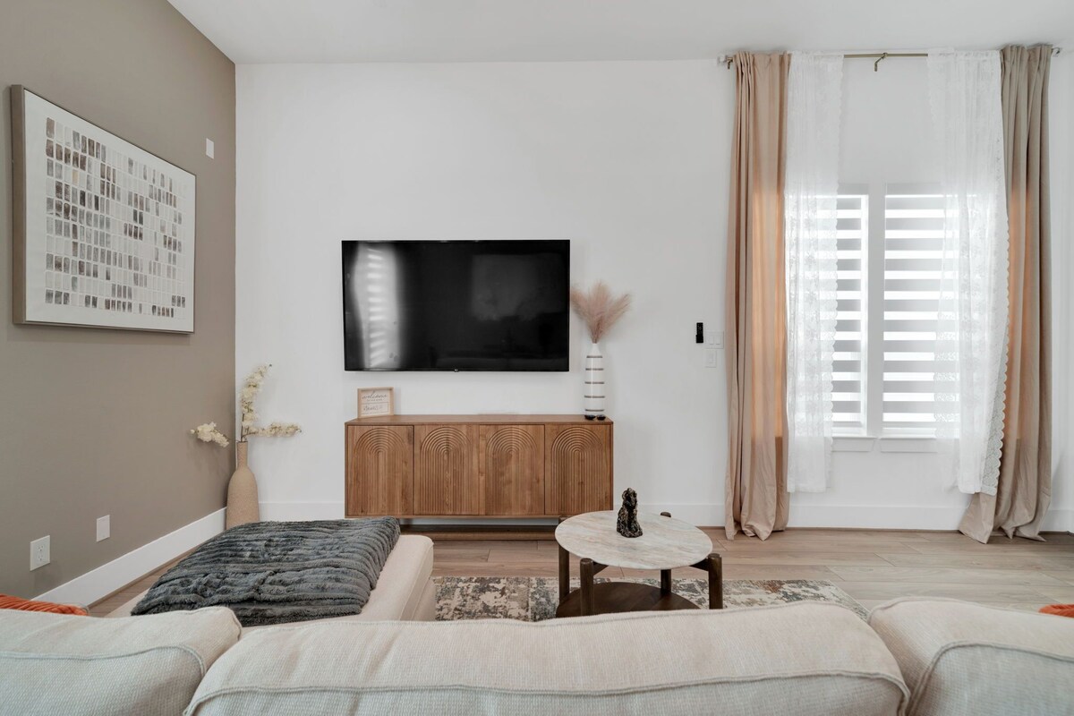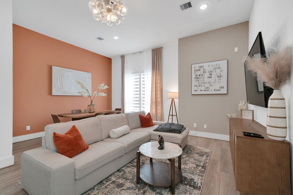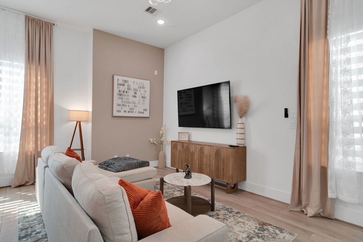 Welcome to Casa Solterra, a cozy and modern 3-bedroom, 2.5-bath townhouse designed for families, groups, and business travelers alike. With warm earthy tones, spacious living areas, and thoughtful amenities, this home is perfect for your Houston getaway. Enjoy gathering in the open living room, sharing meals at the dining table for 8, or relaxing in the first-floor lounge with comfy chairs and mirrors. The home also features a game display in the ante room, a private-entrance bedroom with Jack & Jill bath, and a master suite with ensuite bath and walk-in closet. Every bedroom includes a walk-in closet, making Casa Solterra ideal for both short and extended stays. For work or play, the property is equipped with hardwired fast internet connections in every room, plus HDMI ports in the living room and master bedroom for streaming, gaming, or presentations. Located less than 10 minutes from NRG Stadium and Minute Maid Park, and within 15 minutes of Downtown Houston, The Galleria, the Texas Medical Center, the Museum District, Hermann Park, and the Houston Zoo. Our prices include all fees. No hidden fees.