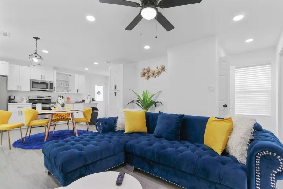 Relax in this modern 3BR/3BA Houston home just 7 miles from Downtown. Enjoy a private hot tub, cozy fire pit, and outdoor games in your fenced backyard. Inside, unwind with Smart TVs, fast WiFi, and a fully stocked kitchen. With free parking, self check-in, and washer/dryer, this family & group-friendly retreat sleeps 7 comfortably—perfect for getaways, business travel, or game-day weekends! ✨ Modern Houston Retreat | Hot Tub • Fire Pit • Games Welcome to your private Houston escape, a stylish 3-bedroom, 3-bathroom home designed for families, business travelers, and groups of up to 7. Just 7 miles from Downtown Houston, this home combines comfort, convenience, and entertainment with sought-after amenities like a hot tub, fire pit, outdoor games, Smart TVs, free parking, and high-speed Wi-Fi. Whether you’re visiting for a concert, sports game, convention, or a family getaway, this space offers everything you need for a memorable stay. 🛋 Comfortable Living & Dining Step into a bright and open living room featuring a deep navy sectional sofa, modern décor, and a 55” Smart TV with streaming access. Vibrant yellow chairs in the dining nook make meals and game nights both stylish and cozy. With board games like Jenga, plenty of seating, and fast Wi-Fi, the home is designed for relaxation and connection. 🍳 Fully Equipped Kitchen The modern kitchen has everything you need for cooking at home , stainless-steel appliances, quartz countertops, cookware, and a coffee/tea station. Whether you’re preparing a quick breakfast before heading downtown or hosting a group dinner, this space makes it simple and convenient. 🛌 Bedrooms & Bathrooms -Master Suite: King bed with plush headboard, Smart TV, and private en-suite bathroom. -Second Bedroom: Queen bed, sleek design, Smart TV, and cozy linens. -Third Bedroom: Queen bunk bed with soft bedding and natural light. With three full bathrooms, everyone gets their own space. Each features modern vanities, mirrors, stocked toiletries, and fresh towels — ideal for groups and families. 🌳 Outdoor Oasis Your private backyard is built for both relaxation and fun: -Hot Tub for soaking and unwinding after exploring the city -Fire Pit for cozy evenings with friends and family -Outdoor Games like cornhole and Jenga to keep everyone entertained -This combination of amenities is among the top searches on VRBO giving your group both comfort and fun in one place. 🌆 Location Highlights -Only 7 miles from Downtown Houston -Quick drive to Minute Maid Park, Toyota Center, and Discovery Green -Easy highway access for conventions, shopping, and family attractions -Local dining and grocery stores nearby for added convenience ✅ Guest-Loved Amenities -Hot Tub, Fire Pit & Outdoor Games -Free Driveway Parking (2 cars) -Self Check-In with Smart Lock -High-Speed Wi-Fi & Multiple Smart TVs -Fully Stocked Kitchen + Coffee Station -Washer & Dryer for Longer Stays -Family-Friendly Home (Sleeps 10) 💫 Why Book Here Guests love this property because it delivers the essentials they search for — hot tub, fire pit, outdoor fun, free parking, and Wi-Fi — all in a modern home near downtown Houston. Whether it’s a family vacation, group trip, or business stay, this house balances style, comfort, and convenience to give you the perfect Houston experience. Please Note: We do not allow any parties in our house and request you to not book if you’re looking to host one. Our prices include all fees. No hidden fees.