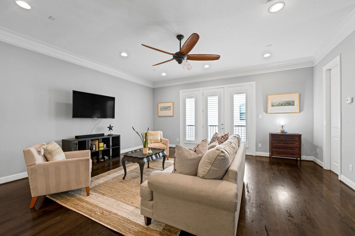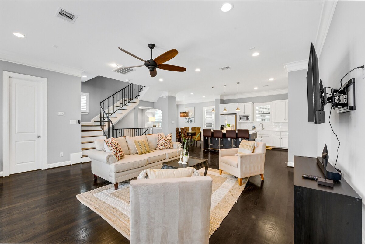 The home is spacious and cozy at the same time. With over 2200 sqft the home feels large enough to accommodate a large family with a few furry friends. The home is a 3 bedroom & 3.5 bath townhome. Master bedroom and guest bedroom on third floor and one large guest bedroom on the first floor. Kitchen is on the second floor. We have two fold away twin beds in the master bedroom that can sleep another 2 adults in a room of your choice. With over 2200 sqft the spacious living room, kitchen and dining area is great for hosting family and friends on a long or short vacation. The home has a small patio on the side with two tables and chairs to enjoy and outdoor coffee or meal al fresco. Quiet time: 10p-7a, we ask that noise be kept to a minimum because we want to be respectful to our neighbors. Thank you We are pet friendly and have a $100 pet fee, per pet. Our prices include all fees. No hidden fees.
