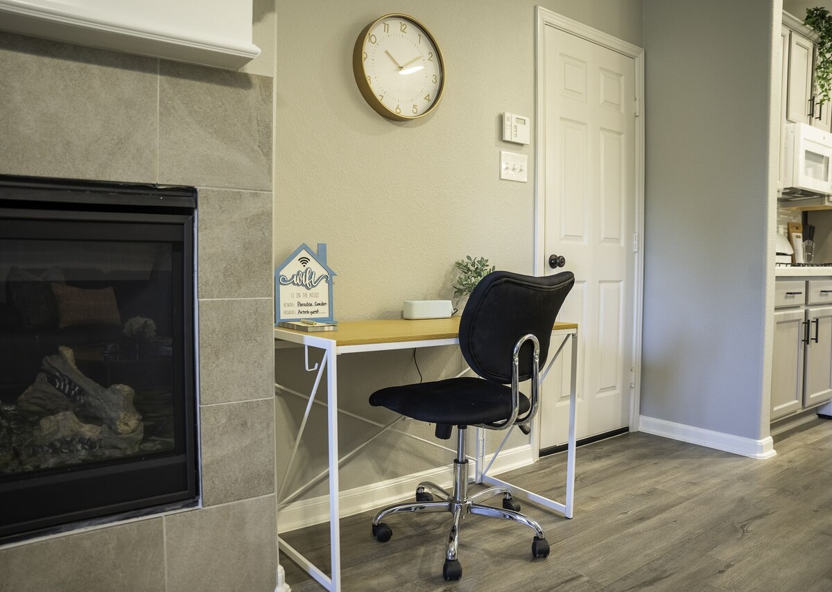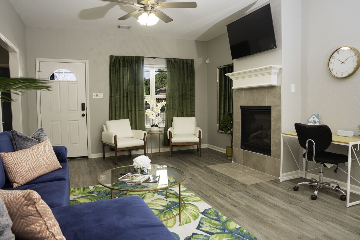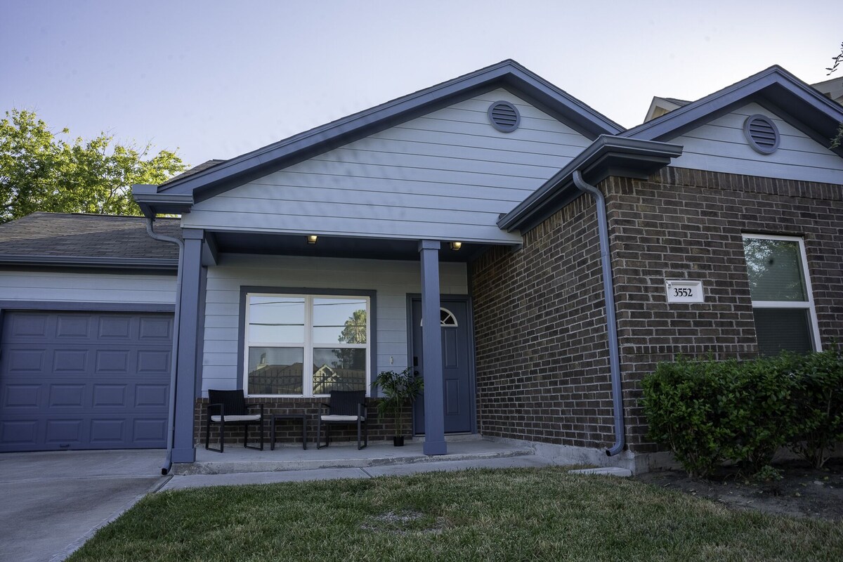 Be ready to relax & unwind in this brand new gated 3 bedroom house, centrally-located in the heart of Houston. With easy access to the Medical Center, MD Anderson, downtown, NRG (Texans NFL stadium), University of Houston, Texas Southern, both major airports & more, your trip will be full of options to explore the city or relax in the comfort of this open-floor living space & garage parking. Enjoy fast wi-fi to surf the web on our dedicated work space or stream your favorite shows. Living Space An oasis in the heart of Houston. Enjoy this newly built 3 bedroom gated house with an indoor fireplace. Stylish living space that will make you want to sit back and sip a mojito. Dedicated Workspace Fast wifi that is more than capable for gaming devices and streaming all at once. Kitchen Fully equipped kitchen with stainless steel appliances, granite counter tops, and essential kitchen items ( blender, toaster, Keurig, etc...) Premium pots and pans for cooking. Coffee bar is fully stocked with a variety of options from tea to coffee. Drip coffee as well as K-cups available. Seasonings and spices for your personal use. Laundry Washer and dryer located across from kitchen island. In addition you will find iron, iron board, garment steamer, hangers, and first aid kit. Vacuum is located in the washroom on the left. Additional cleaning supplies located under sink in the kitchen. Please utilize to minimize cleaning expenses. ABSOLUTELY NO SMOKING. You will be charged an additional $150/day if this rule is violated. Parking You may park in the 1 car garage. You will need to open the garage from the inside of the home first. There is additional parking in front of garage and If more parking is needed you may park on the street directly outside the gate. ABSOLUTELY NO PARTIES Our prices include all fees. No hidden fees.