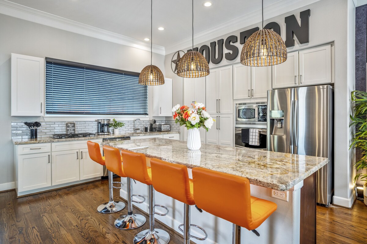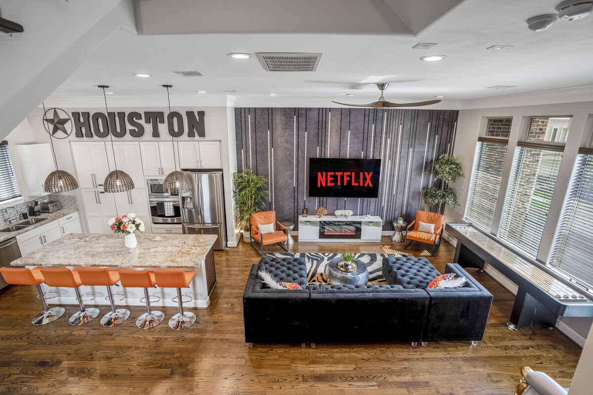 This home is perfect for entertaining large groups and has a something for everyone! Four stylish themed bedrooms: Sexy Red Kiss Room, Garden Room, Glam/Bachelorette Room, and Skyline Bunk Room. We have a fully stocked kitchen, TV's in every room, sleeps 16 with gated parking/garage. We've designed a place that's cool, with a hip vibe roof top terrace and views of the Houston Skyline. Private gated property and driveway, double car garage, two additional secured on property parking and lots of free street parking is available. The home offers a total of 4 spaces for cars to be parked behind the gate. Plus and were Pet Friendly. 10 Minute WALK, 2 minute CAR RIDE to Downtown Houston. Located within walking distance to multiple stadiums: Minute Maid, Toyota Center, PNC Stadium, Brown Convention Center. 18 miles to George Bush Int'l Airport 9 miles to Hobby Airport There's over 20 Brewery's, Clubs, Disco, Rooftop bars and restaurants within 1 mile Our prices include all fees. No hidden fees.