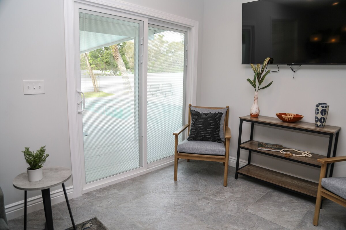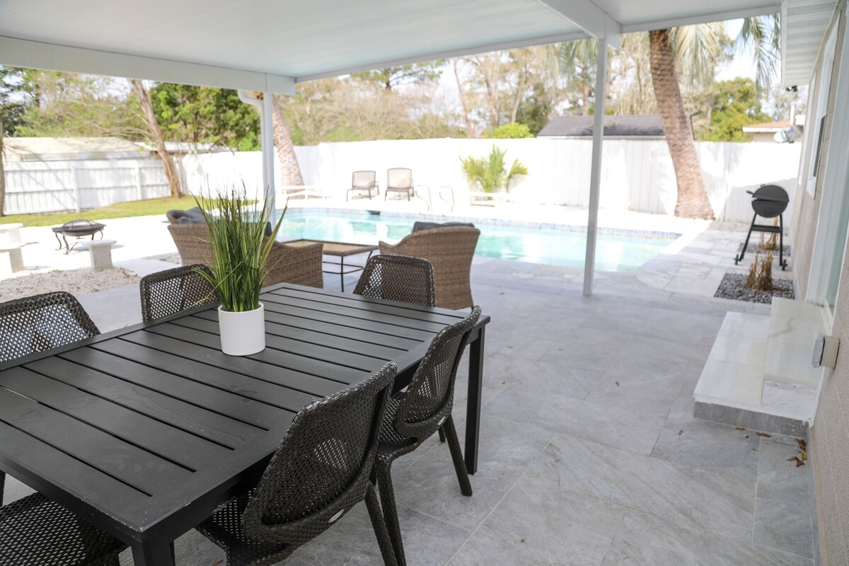 Enjoy a stylish bit of FL paradise at this centrally-located pool home. Access downtown and the beaches easily. Enjoy the FL sun under the palms, in the pool and on the gorgeous patio. This house comfortably sleeps 9. There are 4 bedrooms. Beds include 2 kings, 1 queen, 1 full, and a pull out sofa.