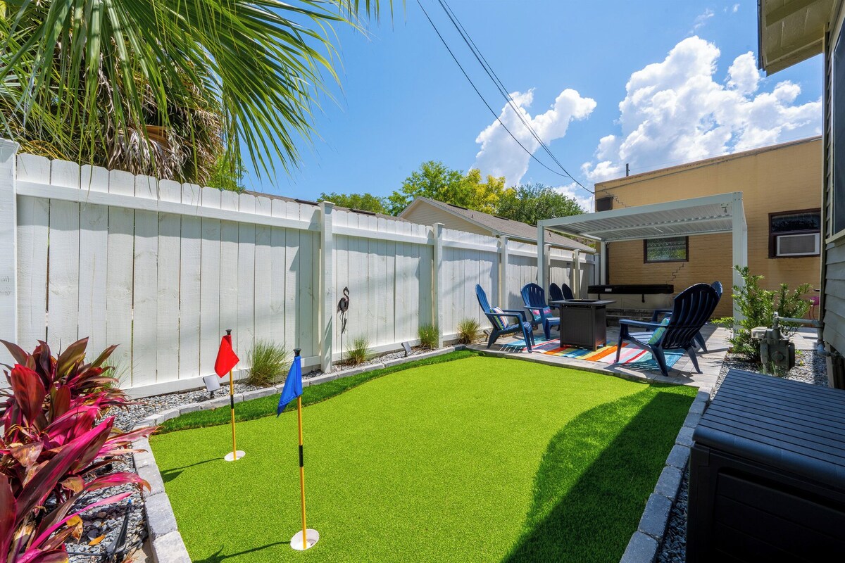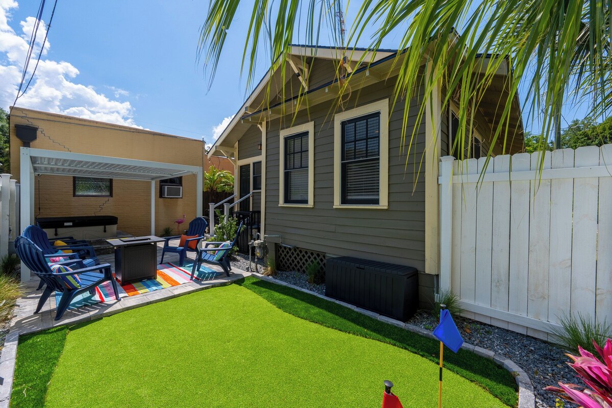 Nestled in the heart of the city, our charming bungalow offers a cozy escape for your next getaway. With two bedrooms and one bathroom, it comfortably accommodates small families or groups of friends looking to explore all that Jacksonville has to offer. Unwind in style in our backyard oasis, complete with a bubbling hot tub, mini golf, grill and plenty of outdoor seating. Close to restaurants, shops, bars and attractions! Available when needed. Springfield is an up-and-coming residential area known for its Historic District with late-19th- and early-20th-century houses, explorable via bike tours. The Karpeles Manuscript Library Museum shows original scientific and cultural documents in a neoclassical former church near Henry J. Klutho Park, which has tennis courts. The neighborhood is also home to an emerging craft brewery scene. You will have full access to the property. Sleeps 7. Full kitchen (fridge w/freezer, microwave, dishes, silverware, and coffee maker), towels, sheets, etc. Wifi is included with a flat screen TV. Fully furnished with AC and wi-fi included. Some of the amenities we have include: **Netflix and Hulu available **Smart TVs ** fridge ** Microwave **Coffee pot with coffee, cream, and sugar ** Eating Utensils **Laptop-friendly workspace ** Mini-golf **Outdoor Seating **Grill **Hot Tub ** Sleeping: 2 bedrooms, 2 living rooms w/ 2 separate pullout couches Car or Uber. Health & Safety: We prioritize the health, safety, and comfort of our guests. Each stay is followed by a thorough cleaning to maintain a welcoming environment. Late Check-Outs & Early Arrivals 1-2 hours: $100 2-3 hours: $200 Note: Early arrivals and late check-outs are not guaranteed due to our tight cleaning schedule. Please request approval in advance. Refund Policy A 3.9% processing fee on refunds is non-refundable. Refunds will be the amount paid minus this fee, per Stripe's policy. This applies to direct booking and bookings made through select booking channels. General Guidelines ●Pets: A pet fee of $75 applies per reservation for up to 2 pets. Bringing a pet without prior notification incurs an additional $100 fee, and we may end your stay early. No cats allowed. If your pet causes any damages, additional charges will incur to cover repair or cleaning costs. ●Age Requirement: Primary guest must be 21+, with an adult over 21 present during the stay. Food & Drink: No food or drink in bedrooms (closed water bottles allowed); extra cleaning fees for stains. ●No Smoking: Smoking of any kind is prohibited; $200 fine for violations. Additional charges will incur to cover repair or cleaning costs. ●Trash: Dispose of all trash in outside bins before departure. ●Damages: Report any damages within 24 hours of occurrence or immediately upon arrival. Failure to report damages could result in liability for repair or replacement costs. ●Dishes: Wash all dishes and run the dishwasher (if applicable) before leaving. ●Windows: Keep windows closed for security. ●Laundry: Avoid overloading machines; do not wash sandy items, and clean the dryer lint trap. ●Storage Closet: Keep this area closed and locked. ●Consumables: Leftover items are at your discretion; freshness is not guaranteed. ●Furniture: Do not rearrange. ●Parties & Events: Unauthorized parties are not allowed; violations will result in additional charges and immediate eviction. ●Only registered guests are permitted to stay at the property. If you would like to add extra guests beyond the number initially registered, please request approval before finalizing your booking. Any additional guests that exceed the maximum allowed at the property will incur an additional charge of $100 per person. This requires approval from us prior to booking. ●Illegal Activities: Will result in immediate eviction. ●Quiet Hours: 10pm to 7am. Please be respectful of neighbors. HOT TUB RULES ●Use at Your Own Risk: By using the hot tub, guests acknowledge and agree that they are using these amenities at their own risk. ●Supervision: For safety reasons, children under the age of 16 must be supervised at all times while using the hot tub. ●Health & Safety: Guests should not use the hot tub if they are under the influence of alcohol or drugs. Please shower before entering the hot tub to maintain cleanliness. ●Cleanliness: Please ensure that no oils, lotions, or soaps are brought into the hot tub. This helps maintain the quality of the water for all guests. ●Proper Use: For your safety, please follow all posted guidelines and do not engage in risky behavior in the hot tub (e.g., diving, rough play). ●Damage: Any damage to the hot tub caused by misuse will be charged to the guest. Thank you for your cooperation, and enjoy your stay! Our prices include all fees. No hidden fees.