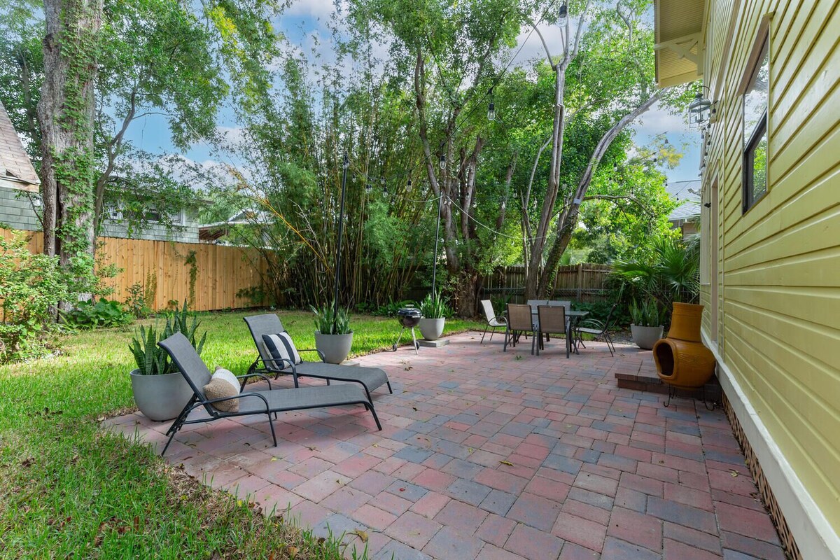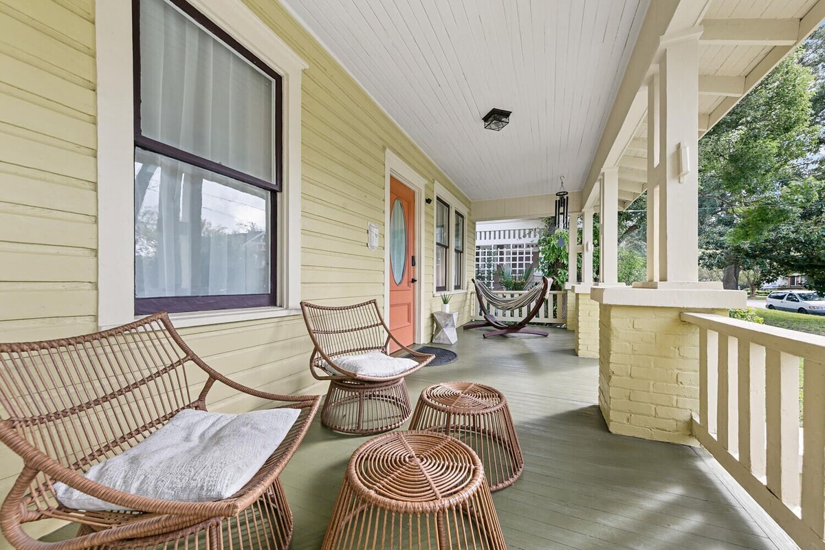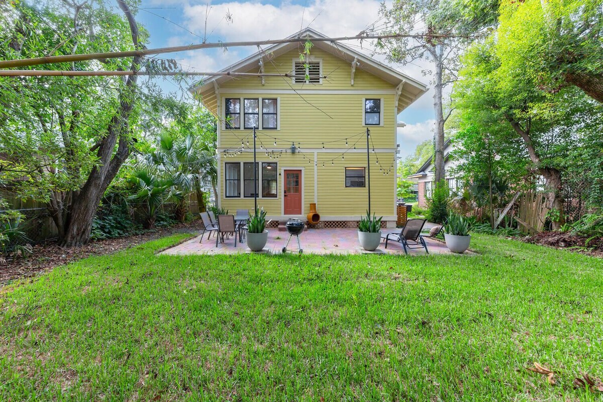 Welcome to The Gathering House at Riverside, a thoughtfully renovated 1940s home designed specifically for groups seeking both connection and privacy. This 6-bedroom charmer features keypad locks and dedicated workspaces in every room, making it perfect for professional retreats, extended family gatherings, or friend reunions where individual schedules may vary. The Gathering House seamlessly blends original 1940s architectural character with thoroughly modern amenities following our comprehensive 2025 renovation. Classic hardwood floors, period fireplaces, and charming built-ins coexist beautifully with contemporary comforts throughout this spacious two-story home. Each of our six bedrooms has been thoughtfully designed with today's travelers in mind. You'll find plush memory foam mattresses promising restful sleep, large-screen smart TVs for entertainment, and dedicated workspaces with convenient outlets. The bedrooms showcase a variety of styles—from traditional spaces with historic fireplaces to bright rooms with trendy tropical mint accents and decorative iron beds. Keypad locks on bedroom doors add an extra layer of security and convenience, especially appreciated by groups where members keep different schedules. The home's flexible layout accommodates groups of varying sizes. The main floor offers one bedroom plus a family room that easily converts to a second bedroom when using the kitchen door as the primary entrance. Upstairs, you'll find four additional private bedrooms, ensuring everyone has their own retreat space. The common areas invite connection and conversation. Our bright yellow front porch with comfortable rattan seating creates the perfect setting for morning coffee or evening unwinding. The back patio features a charcoal grill and outdoor dining, ideal for group meals under the Florida sky. Inside, the generously sized living room features comfortable seating and a unique hanging chair—perfect for relaxation after productive work sessions. The sunroom-style dining area bathes in natural light through large windows overlooking lush greenery, creating an ideal gathering spot for meals, meetings, or evening board games. The fully renovated kitchen combines functionality with style, featuring black tile countertops, ample cabinet space, and updated appliances including dishwasher and full-size refrigerator. Period-appropriate white cabinetry maintains the home's historic aesthetic while providing modern convenience for group meal preparation. The unique bathroom arrangement spans four separate rooms: one full bathroom with tub and shower, one full bathroom with shower only, a dedicated powder room, and a standalone shower room. This thoughtful configuration—equivalent to three full bathrooms divided among four spaces—offers flexibility for larger groups and helps prevent morning congestion. Located just 0.3 miles from the heart of 5 Points' shopping and dining district and 0.5 miles from Riverside Park, The Gathering House offers the perfect home base for exploring Jacksonville's most charming neighborhoods. Whether you're visiting for business retreats, family reunions, or professional conferences, our renovated historic home provides the space, comfort, and convenience to make your group stay memorable. Our prices include all fees. No hidden fees.